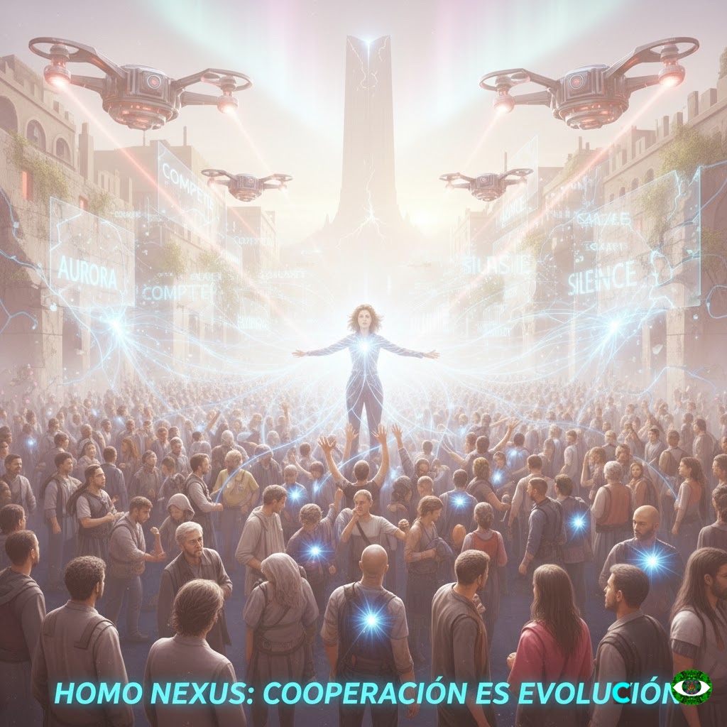 “Míralos en la plaza, mujer, sin conocerse se cuidan, mientras los drones del tirano las conciencias invalidan. Él cree que el orden es silencio y sumisión, nosotros sabemos que es latido y cooperación. Si uno tropieza, mil hombros se ofrecen, los muros del sistema ante el Nexus se estremecen. No hay algoritmo que calcule esta nobleza, la unión es nuestra arma, la paz nuestra fortaleza.”
